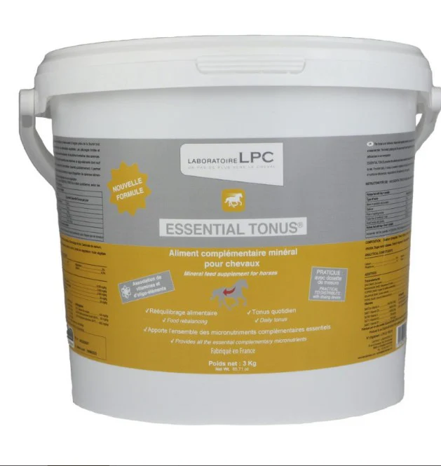 Pour les chevaux ayant une alimentation traditionnelle (foin + avoine ou orge), distribuer ESSENTIAL TONUS en permanence dans la ration.Juments gestantes et allaitantes : 150 g. Etalons : 150 g. Chevaux de course ou sport : 100 g. Poulain de 2 mois à 1 an : 50 à 85 g. Petits chevaux et poneys : 50 à 100 g. Pour les chevaux ayant une alimentation mixte (foin + granulés + avoine ou orge) incorporer la moitié des quantités d’ESSENTIAL TONUS ci-dessus à la ration quotidienne, pour chaque type de chevaux.