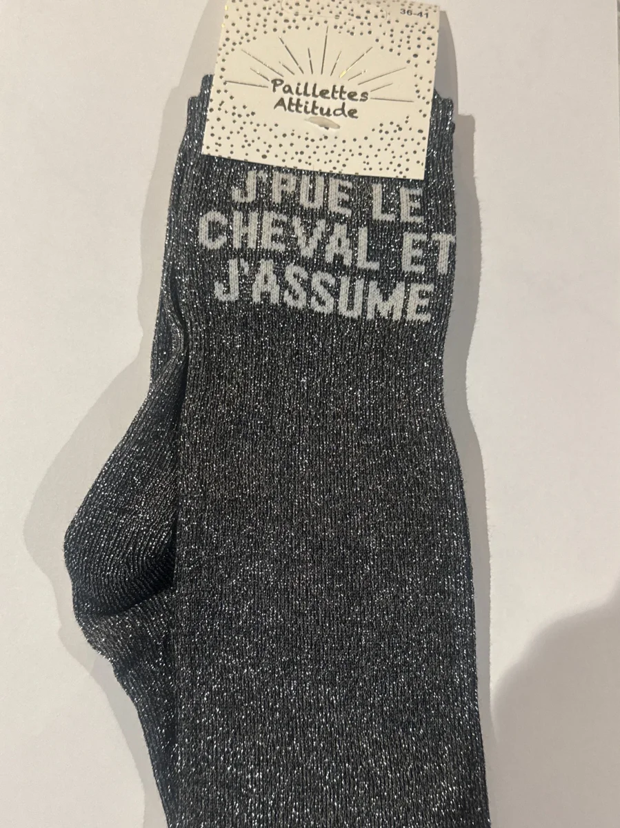Chaussette Paillettes « J’PUE LE CHEVAL ET J’ASSUME » – Paillettes Attitude