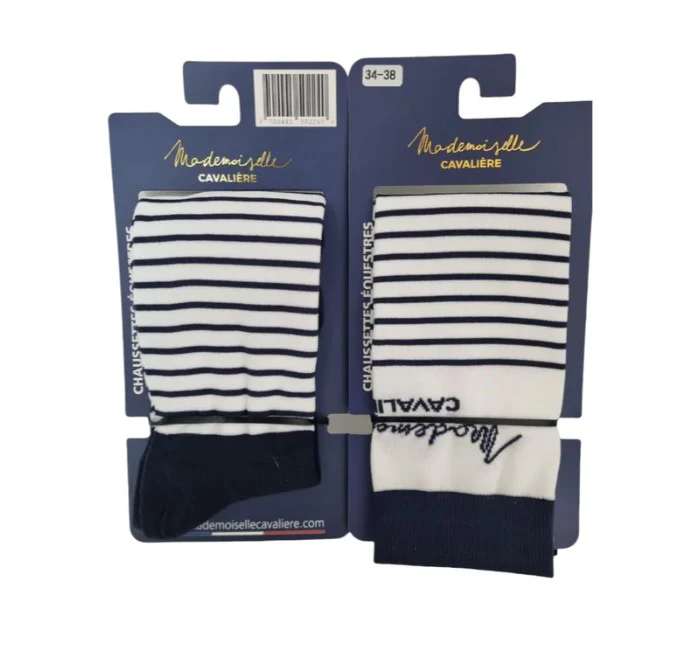 Osez le Marinière Chaussettes MADEMOISELLE CAVALIERE 1 paire de chaussette Couleur : BLANC/NAVY . logo Navy Fine et légère PRINTEMPS/ETE Designed by Mademoiselle Cavalière Composition : – Pieds en Coton – Jambes en Polyester – 3% Elasthanne