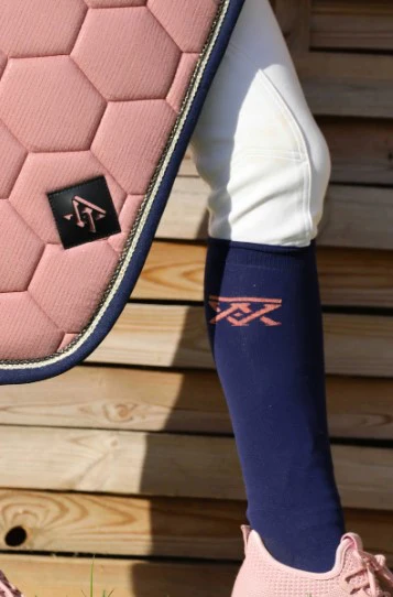 De couleur marine avec le logo Oxxer en rose sur le haut, ainsi que la ligne française sur le bas des chaussettes