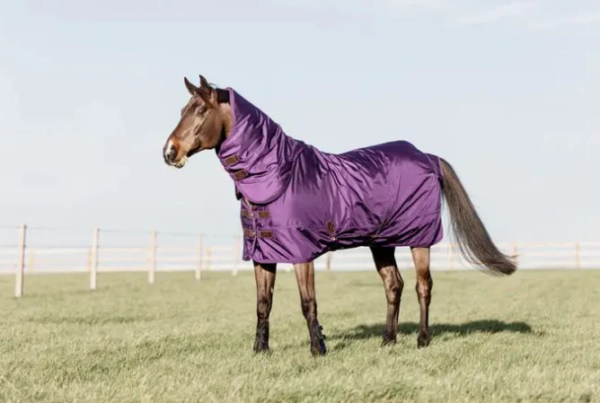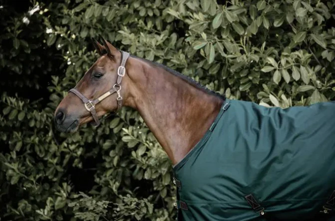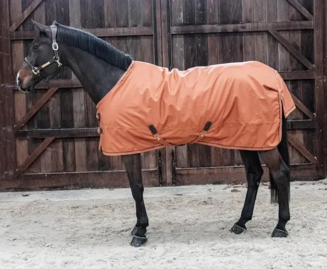 La couverture est de forme anatomique et ne comporte aucune couture sur le dos pour éviter les fuites. Grâce à la peau de lapin artificielle, la couverture se remet toujours à la bonne place après que le cheval se soit roulé. La couverture est équipée d’une fermeture autoaggripante avec 2 fermetures frontales, 2 sursangles croisées en tissu de ceinture de sécurité et une courroie de queue recouverte de plastique (pour un nettoyage facile). Pour plus de protection, il est possible d’acheter un couvre-cou séparé.