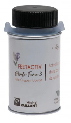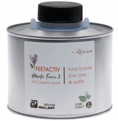 Feetactiv Absolu Force 3 est une huile qui active la pousse d’une corne souple et résistante suite à des lésions de la boîte cornée (seimes, fourmilières…). Elle est particulièrement indiquée sur des pieds secs présentant une corne fragile et cassante. Laisse la corne respirer.