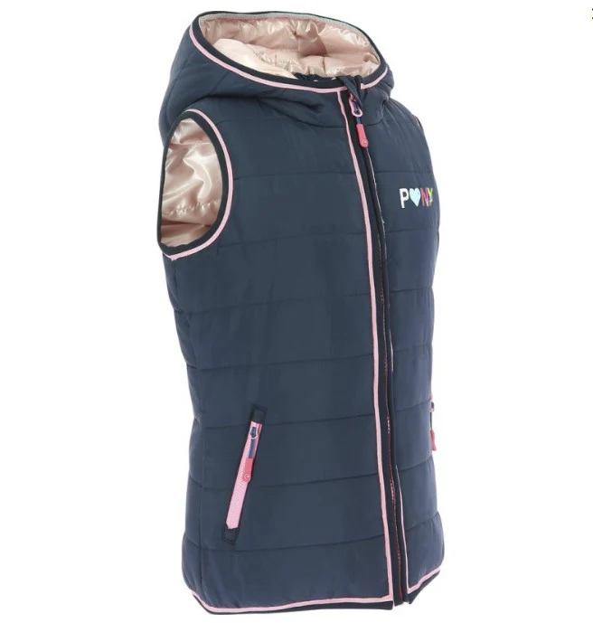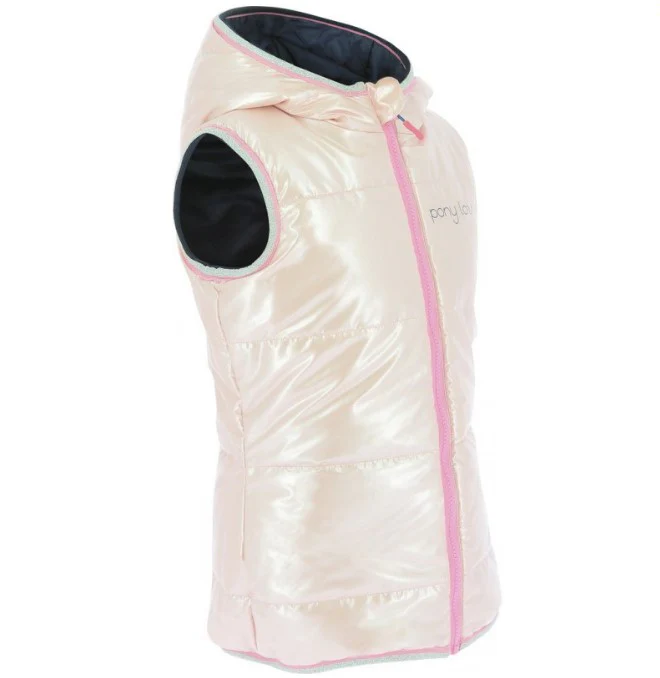 Gilet matelassé réversible à capuche, déperlant et chaud.Marquage PonyLove sur les 2 faces.Poches mains sur la face marine.biais élastiqué autour de la capuche et en bas de veste pour une meilleur protection contre le froid.Composition : 100 % polyester.Lavable en machine à 30°C, pas de sèche-linge, pas de repassage.