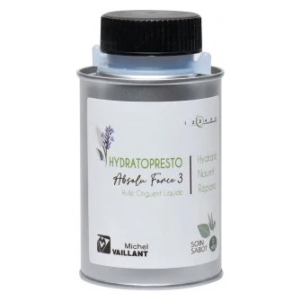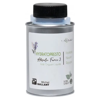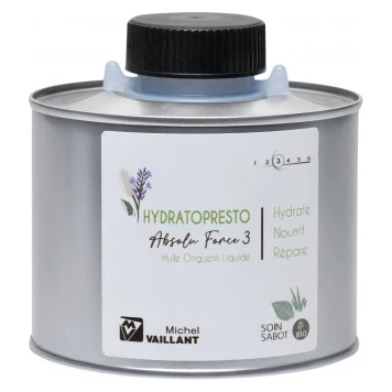 HydratoPresto Absolu Force 3 est une huile indiquée pour les soins hydratants quotidiens et les sabots secs. Protège, hydrate, nourrit et répare. Agit à long terme comme anti-déshydratant. Purifie la fourchette et participe à une pousse saine du sabot.