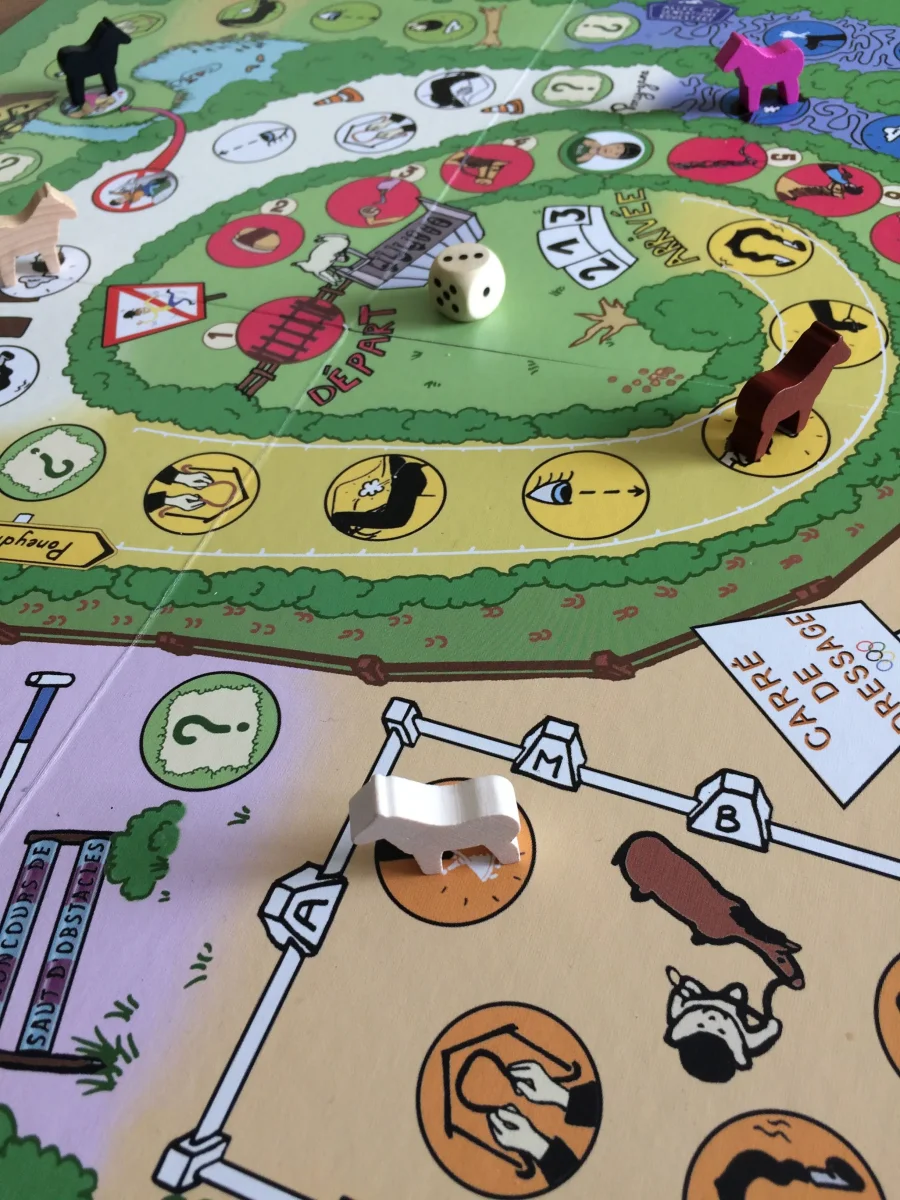 Sur une base de jeu de l’oie, il combine une partie collaborative et des éléments de hasard, mettant en scène des situations d’équitation variées tirées de situations réelles.