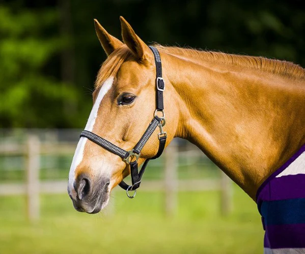 En polypropylène double épaisseur avec têtière et muserolle réglables par boucles. Têtière, montants et muserolle rehaussés de 4 rangées de strass transparents en incrustation. Ouverture rapide de la sous-gorge par mousqueton. Bouclerie en métal nickelé.En polyester tricolore double épaisseur, souple et doux, avec têtière et muserolle réglables par boucles et œillets de renforts. Fermeture rapide de la sous-gorge par mousqueton en zinc. Bouclerie en métal nickelé. Longe tricolore assortie disponible séparément : avec mousqueton tournant réf. 520 008 ou mousqueton anti-panique réf. 520 007.En nylon double épaisseur avec muserolle et têtière réglables doublées néoprène. Ouverture rapide de la sous-gorge par mousqueton. Bouclerie en métal coloris chromé ou or rose. Accompagné d’une longe d’attache de 2,50 m.