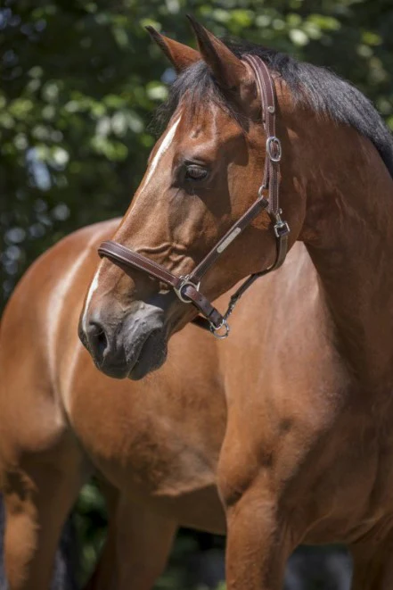 Avec têtière et muserolle réglables, matelassées et doublées cuir ton sur ton et surpiqûres blanches décoratives. Il est équipé de mousquetons pour ouverture rapide de la sous-gorge de part et d’autre et au niveau de l’alliance. Plaque de personnalisation sur montant et bouclerie en métal chrome.
