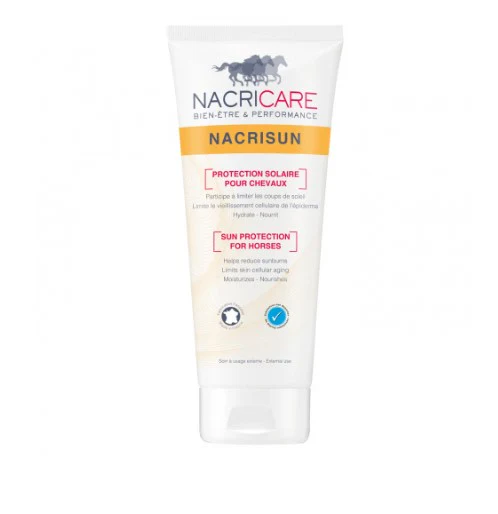 La crème solaire Nacrisun a été spécialement formulée pour les chevaux, les poneys et les ânes en prévention des brûlures dues à une exposition solaire prolongée. Elle protège la peau des équidés sensibles aux UV, qui peuvent se retrouver exposés aux rayons du soleil de façon prolongée au paddock, au pré, au box ou même au travail, en concours hippique…
