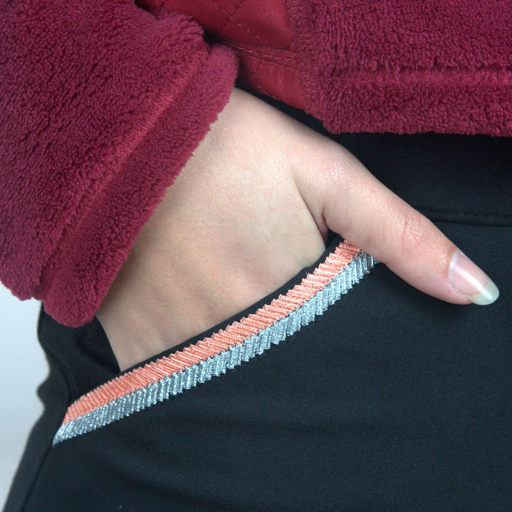 Encore une très jolie culotte d’équitation pour vos graines de cavalières signée Flags&Cup. 2 poches plaquées sur le devant et 2 poches factices sur l’arrière réhaussées de cordelettes contrastées très féminines. Broderie argentée sur la poche gauche. Le pantalon est fabriqué en tissu respirant, léger et très résistant. Les bas de cheville sont en lycra […]