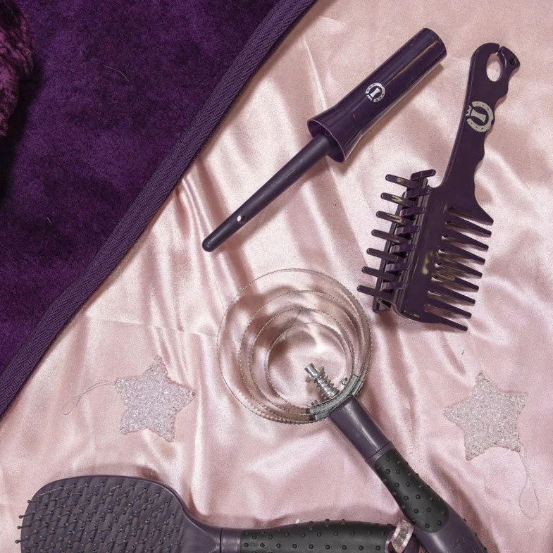 Le peigne tout en un pour faire de jolis pions à vos shetlands, poneys et chevaux. Le peigne pour démêler la crinière de petit tonnerre. La pince pour maintenir les crins. La possibilité d’accrocher vos élastique à la poignée du peigne. Composition: 100% polyester Coloris: noir, bordeaux, violet Taille unique