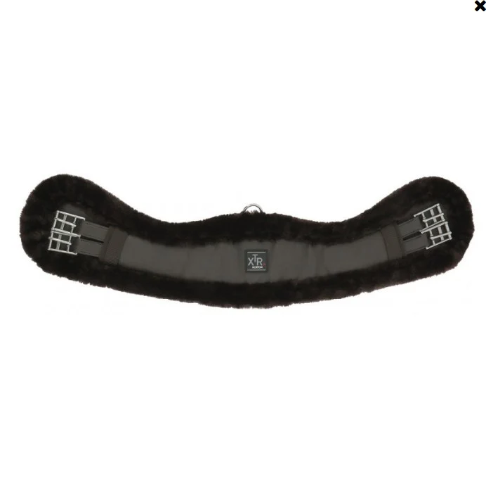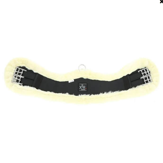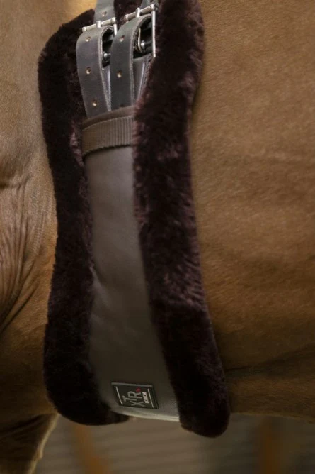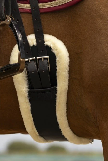 Sangle courte synthétique en polyuréthane aspect cuir, doublée mouton synthétique haute densité. Boucles à rouleaux en inox montées sur support double élastiques, sur chaque côté. Équipée d’un anneau central.