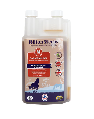 Senior Horse Gold est un complément alimentaire liquide à base d’aubépine, de reine des prés et de bardane. Il est idéal pour les chevaux et poneys prenant de l’âge.