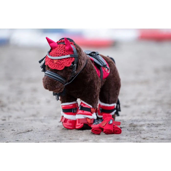 L’équipement complet pour travailler vos Cuddle Pony. Bonnet anti-mouches, tapis de selle, guêtres et cloches. Coloris: marine, rouge