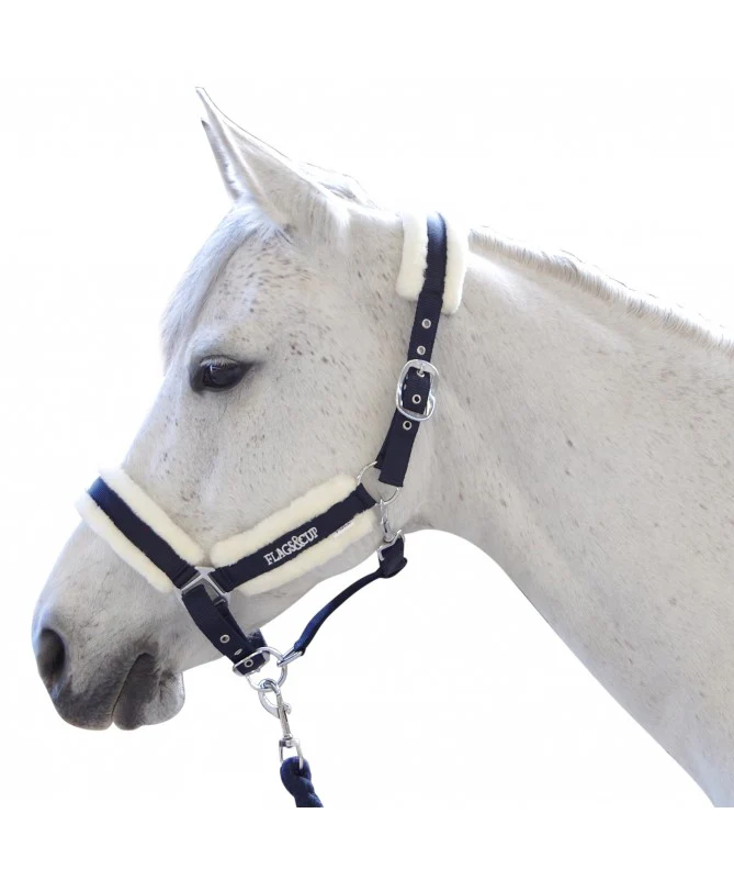 Ce Set licol et longe Flags&Cup VELTA coloré en mouton synthétique est un accessoire indispensable pour votre poney.